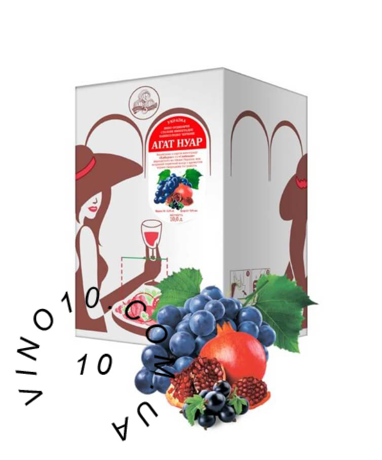 Вино Агат Нуар Вино з бочки зі смаком та ароматом чорної смородини та гранату 10 літрів виготовлене з винограду сорту «Каберне» та «Сапераві», вирощеного в Бессарабії на Півдні України. Оригінальне вино яскраво-червоного кольору, з благородним витонченим смаком та ароматом чорної смородини та зрілого гранату.