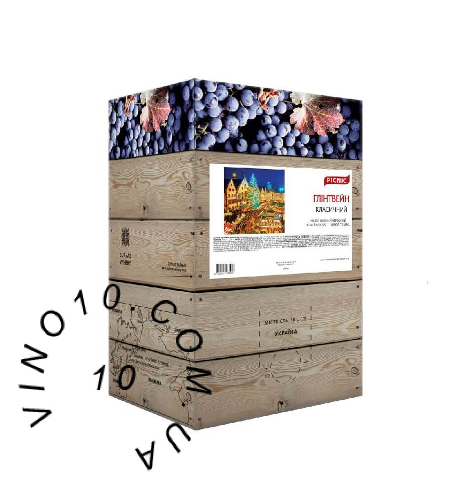 Напій винний виноградний Глінтвейн класичний Пікнік 10 літрів. Ексклюзивний слабоалкогольний напій, створений на основі натурального червоного вина з додаванням прянощів. Щоб домогтися неповторного смаку, аромату, винороби Burnas Winery підбирають збалансований склад спецій і настоюють їх на натуральному вині; натуральне вино створене з трьох сортів винограду – Каберне Совіньйон, Мерло і Сапераві. Так народжується натуральний готовий «Глінтвейн високогірний». Напій створюється за класичною рецептурою популярного у Європі гарячого напою «глінтвейн» або «гаряче вино». До його складу входять натуральне червоне вино, гвоздика, мускатний горіх, кориця та запашний перець. «Глінтвейн високогірний» вже готовий до вживання. Досить просто підігріти напій до температури не вище 70 °C.